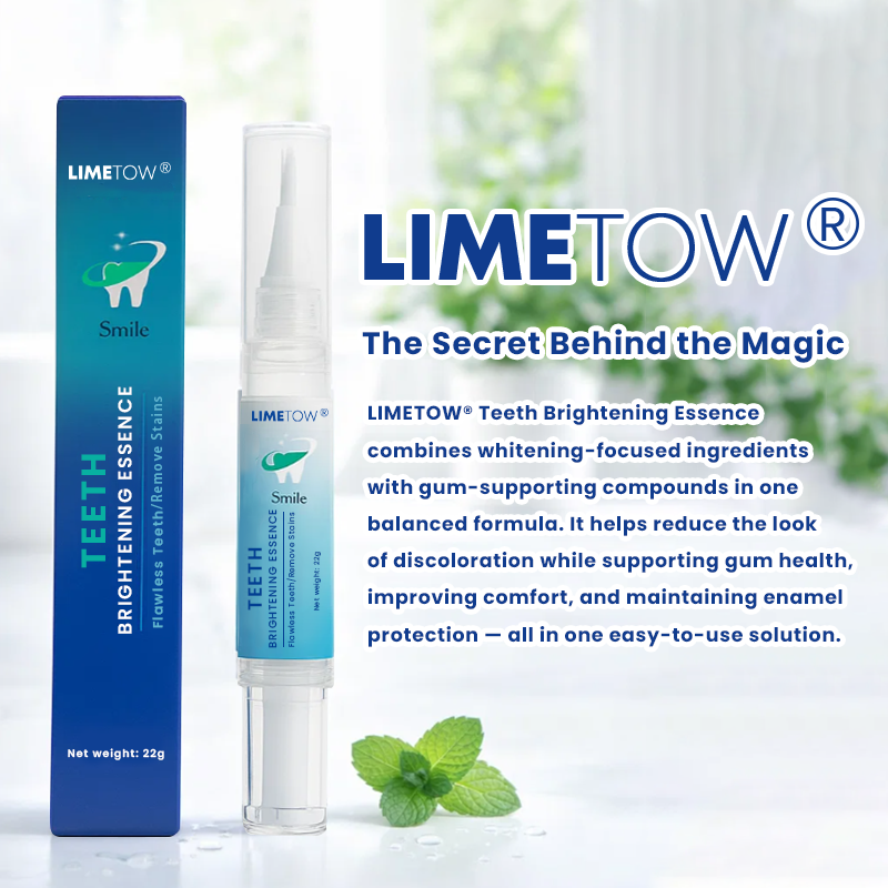 LIMETOW® Teeth Brightening Essence combines whitening-focused ingredients with gum-supporting compounds in one balanced formula. It helps reduce the look of discoloration while supporting gum health, improving comfort, and maintaining enamel protection — all in one easy-to-use solution.